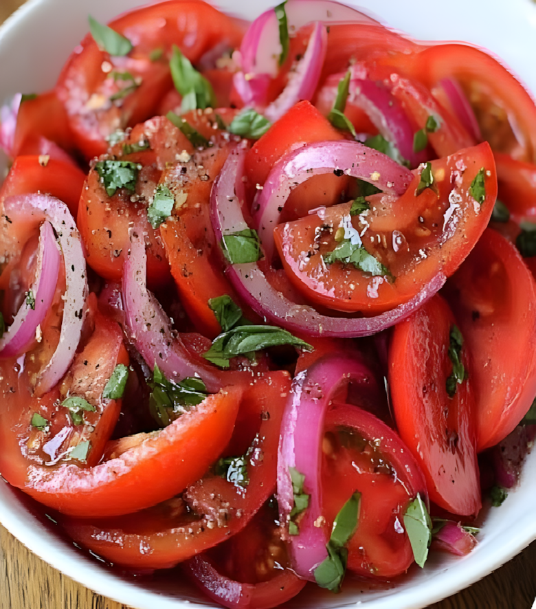 Deze salade van tomaat en rode ui met basilicum is de ultieme zomerse klassieker: fris, licht pittig, vol natuurlijke sappen en boordevol smaak. In slechts 10 minuten maak je een kleurrijk gerecht dat perfect past bij barbecue, pasta, gegrilde vis of gewoon als lichte lunch. Ideaal voor wie houdt van eenvoud en puurheid in de keuken!