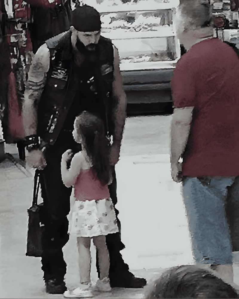 Het zesjarige meisje dat niet kon praten, rende bij Walmart recht in de armen van de gigantische motorrijder en zette in paniek haar handtekening, terwijl de tranen over haar gezicht stroomden.