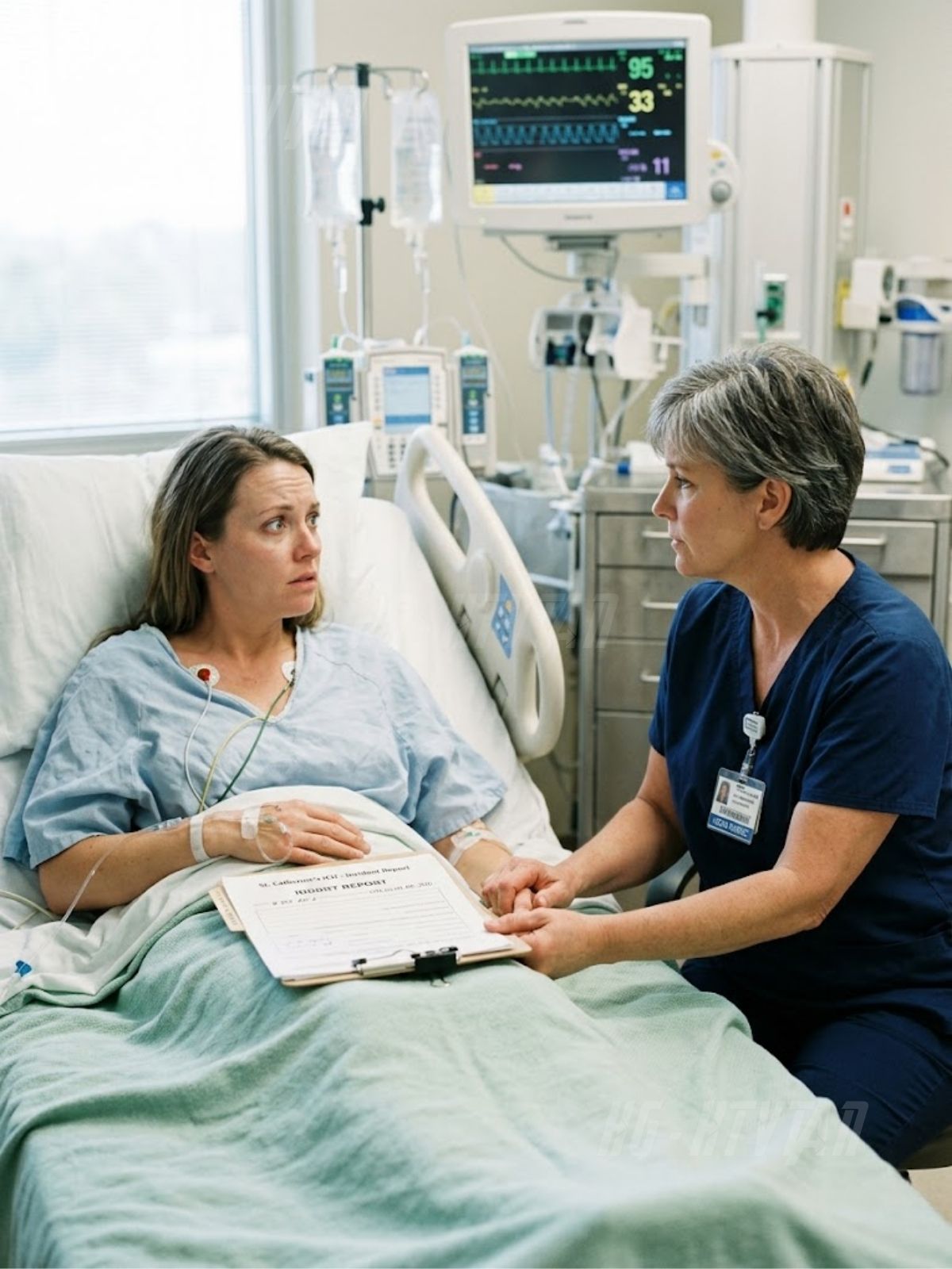 Pat reikte naar het dienblad naast haar en pakte een map. Ze maakte er geen drama van. Dat maakte het alleen maar erger. Ze legde de map voorzichtig over mijn deken en opende hem op een pagina die al gemarkeerd was met een geel tabblad. Een incidentrapport van het ziekenhuis. Standaardformulier, wit papier, zwarte letters. De taal was klinisch. Tijd, datum, aanwezigen, aanbeveling, reactie. Mijn ogen bewogen langzaam, omdat de woorden steeds wazig werden en dan weer scherp in beeld kwamen.