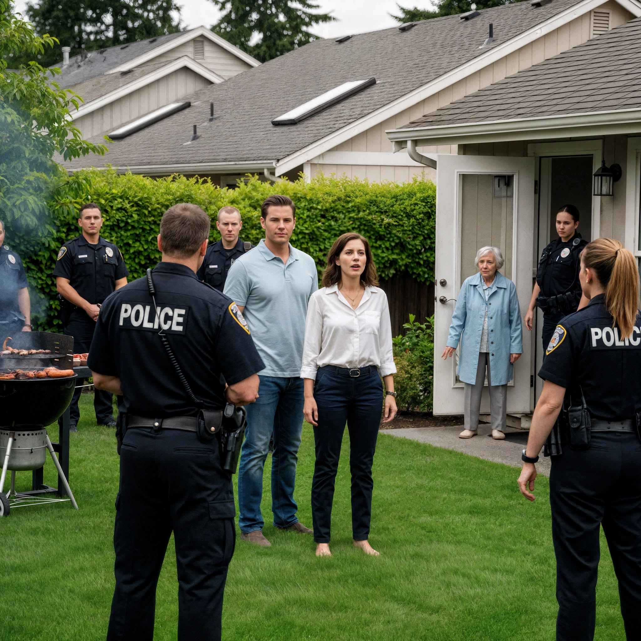 Achter de voorruit zag ik de chaos zich ontvouwen. Buren leunden naar buiten op hun veranda’s. Mijn zoon rende naar buiten en riep: « Wat is er aan de hand? » Agenten gaven iedereen de opdracht om afstand te houden.