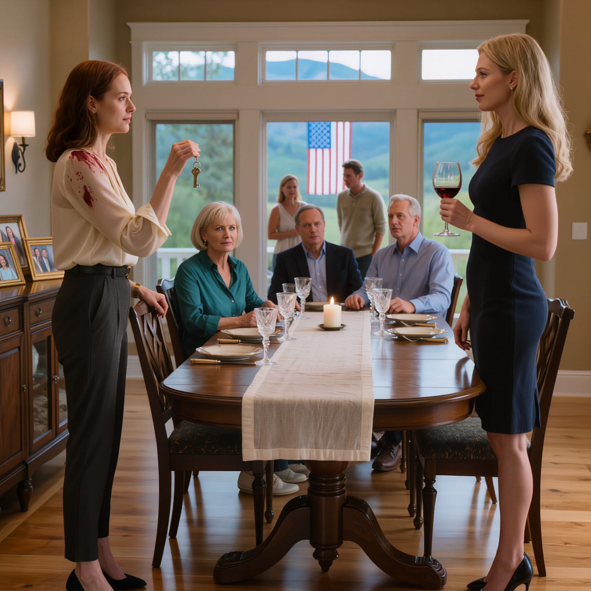 Tijdens het avondeten morste mijn zus wijn over me heen en zei: « Je hebt tot zonsopgang om te vertrekken. » Mijn ouders gingen erin mee. Ik glimlachte alleen maar, liet een sleutel op tafel vallen en zei: « Dan heb je 60 seconden… »