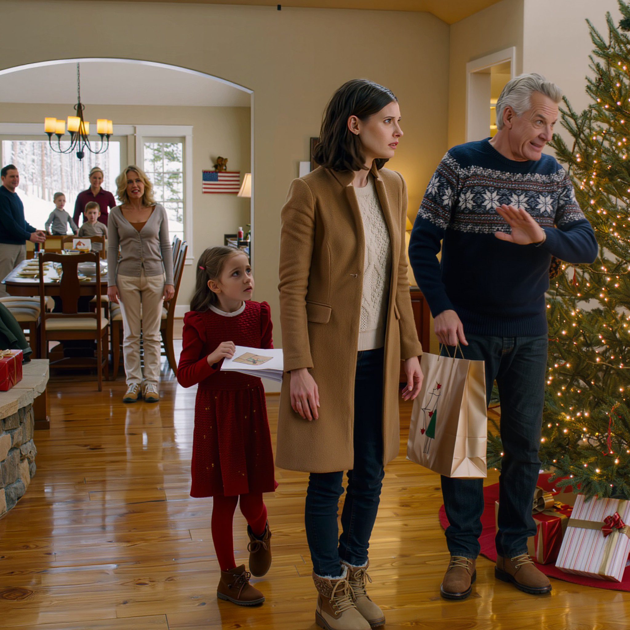 Lily klemde haar hand steviger om de mijne. Haar ogen waren wijd open en hoopvol. Ze hield meer van Kerstmis dan van wat dan ook. Ze had een kleine tekening voor mijn ouders gemaakt – een familieportret met scheve glimlachjes – die ze veilig in mijn tas had gestopt. Ze gaf niet om dure cadeaus. Ze wilde er gewoon bij horen.