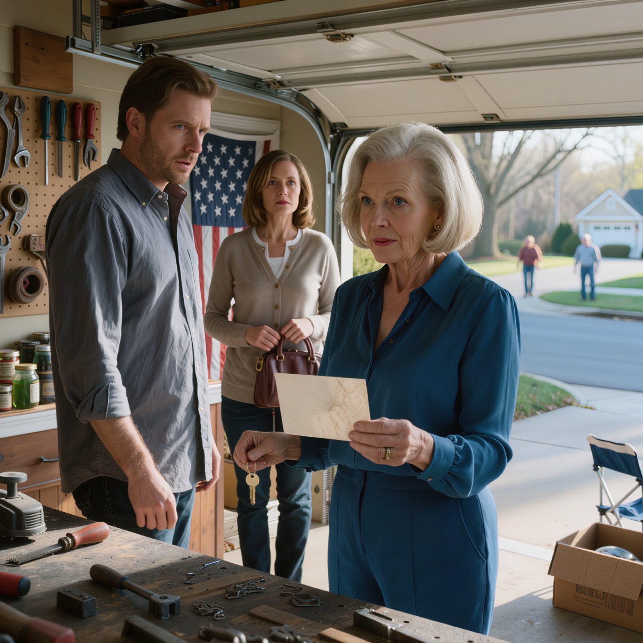 Toen ik de garage van mijn overleden echtgenoot aan het opruimen was, vond ik een envelop: « Voor mijn vrouw. Niet aan onze zoon laten zien. » In de envelop zat een sleutel van een kluisje bij de bank en een adres. Ik ging meteen naar dat adres. Wat ik daar aantrof, maakte dat ik…