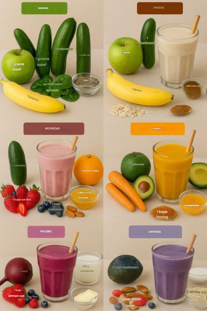Wat als je je dag zou kunnen beginnen met een explosie van smaak, energie en voedende ingrediënten – allemaal in één heerlijk glas? Stel je een week voor waarin elke ochtend bruisend is, je lichaam bruist van vitaliteit en je huid straalt. Dit 6-daagse smoothieplan zit boordevol fruit, groenten en superfoods en is jouw ticket naar een gezondere en gelukkigere versie van jezelf. Elke dag is er een nieuwe mix die je lichaam voedt, je humeur verbetert en je wellnessdoelen ondersteunt – of het nu gaat om gewichtsverlies, een stralende huid of je gewoon op je best voelen. Klaar voor een week vol voedzame en heerlijke smoothies die je energie geven en inspireren? Laten we wat magie creëren en je ochtenden transformeren, slokje voor slokje.