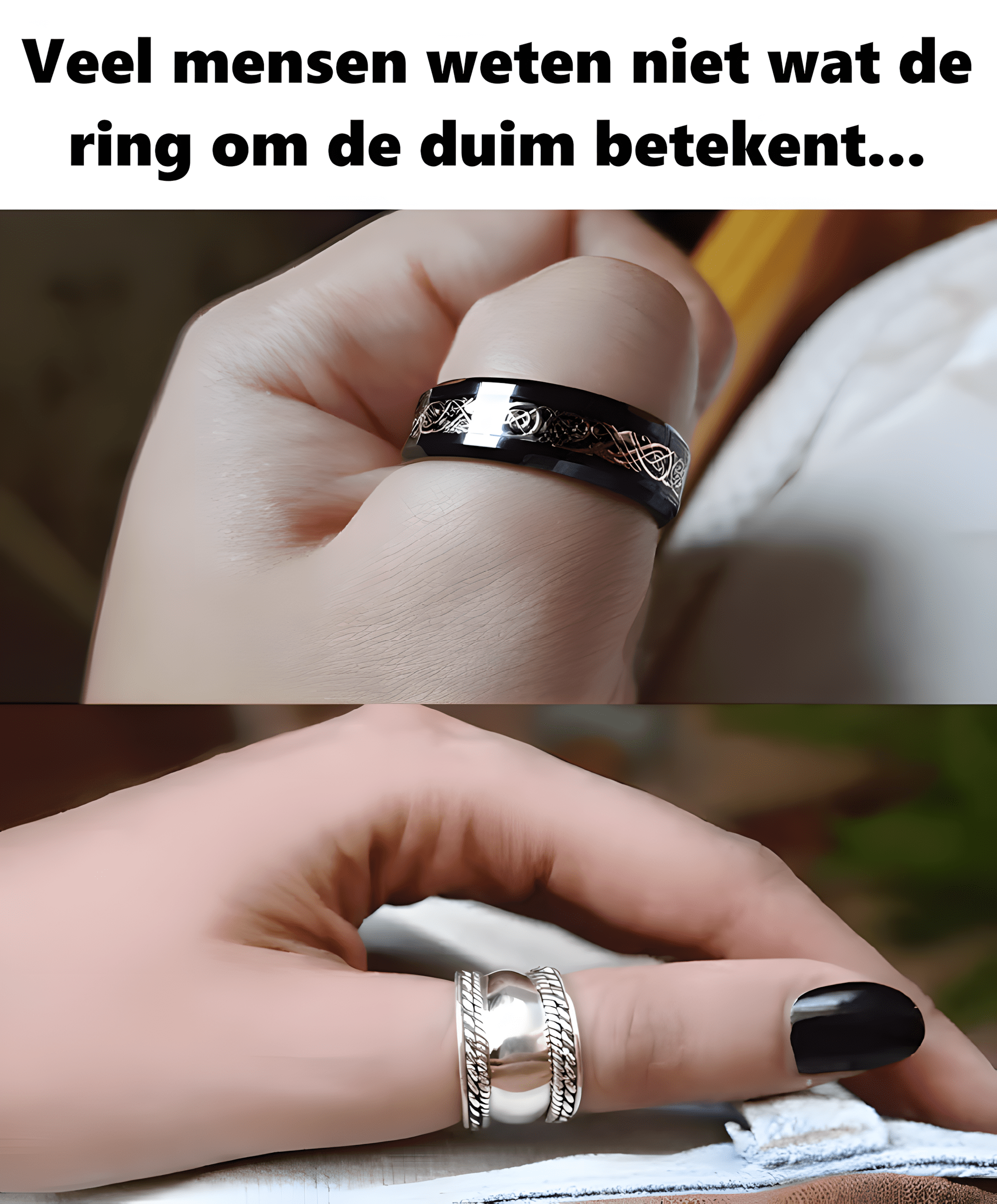 De duim is de enige vinger die zich tegen de andere vingers kan verzetten. Het is een beetje zoals een rebelse hand die je kunt vastpakken, vasthouden en controleren. Door hier een ring te dragen, geef je een duidelijk signaal af: « Ik ben onafhankelijk, ik val op en ik volg de massa niet. »