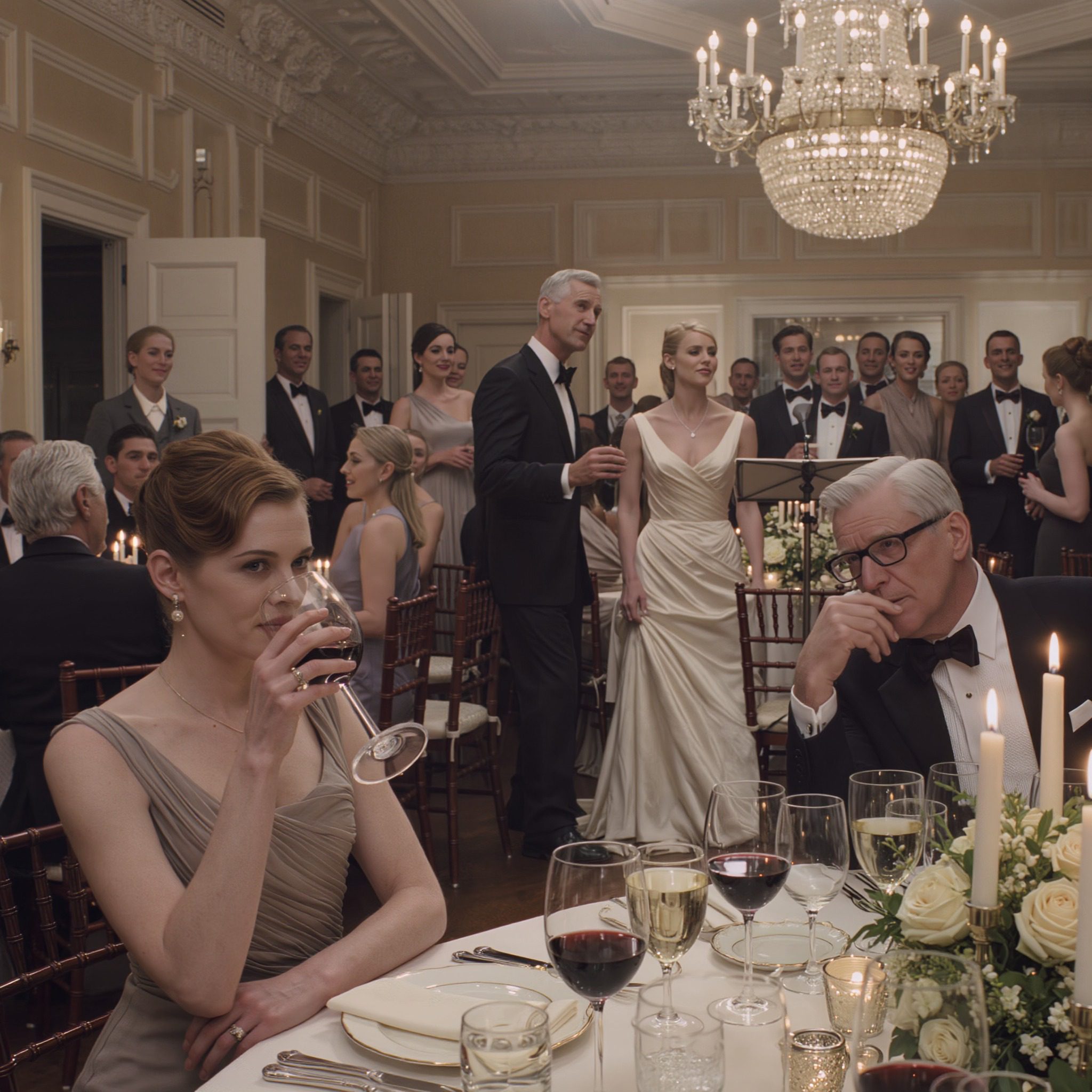 Ik trof hem aan de andere kant van de zaal aan tafel één, vanzelfsprekend. Zilvergrijs haar naar achteren gekamd, een Brioni-pak, lachend met een man met een stevige nek die ik niet herkende. Margaret stond naast hem in een rode jurk, een parelketting rustend op haar sleutelbeen, een hand op Geralds arm alsof ze een vlag aan een mast vastmaakte.