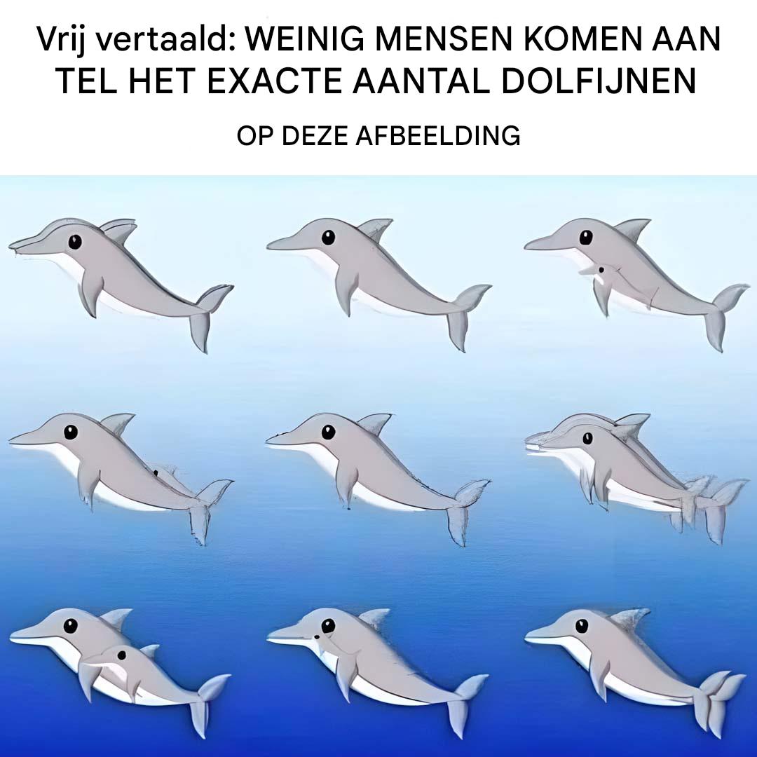 Deze onderwaterfoto lijkt slechts een paar dolfijnen te tonen die in het water spelen. Maar laat u niet misleiden! Er zijn maar liefst zeventien zeezoogdieren in deze scène verborgen. Sommige gaan op in de golven, andere vormen een perfecte weerspiegeling van de silhouetten van hun soortgenoten.