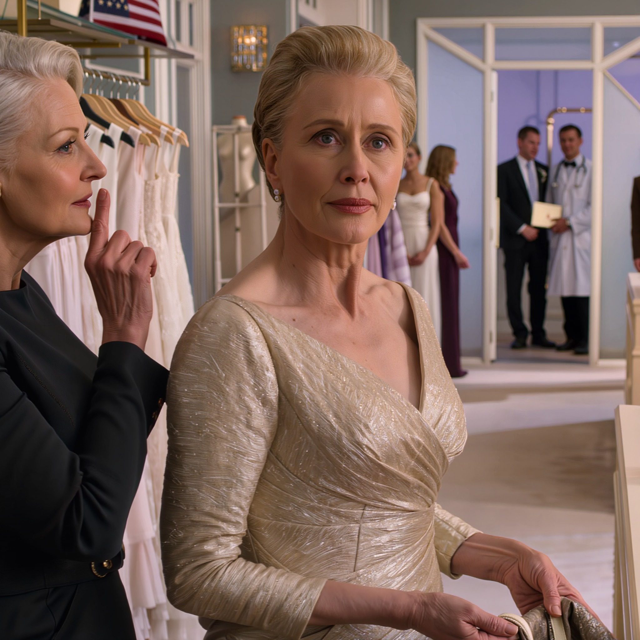 Vóór de bruiloft van mijn dochter ging ik naar een modeboetiek om een avondjurk te passen. De eigenaresse duwde me opzij en fluisterde: « Er zijn dingen die je moet weten. Blijf hier. Zeg geen woord. Vertrouw me. » Ik was verward, maar ik bleef. Minuten later stond ik als aan de grond genageld door wat ik hoorde.