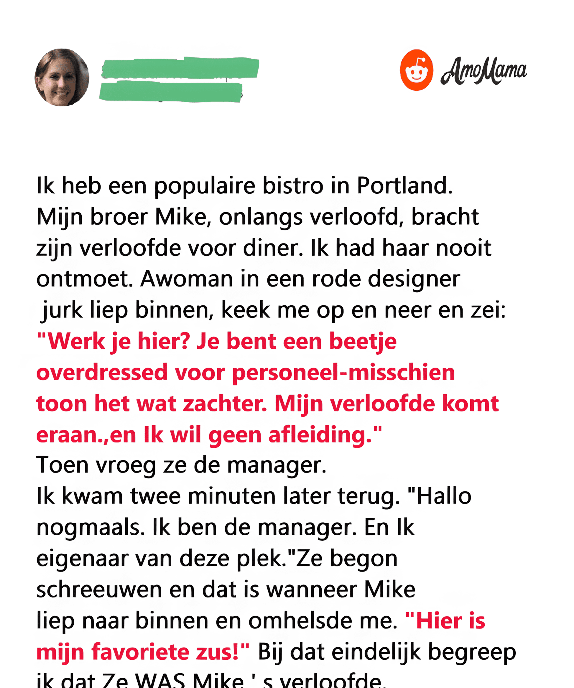« Wacht… werk jij hier? » zei ze, terwijl ze me langzaam bekeek en fronste. « Ik bedoel… niet onbeleefd, maar je bent een beetje te netjes gekleed voor restaurantpersoneel, vind je niet? Zou je niet iets simpelers kunnen dragen? En dat kapsel? Dat is een beetje overdreven. Mijn verloofde komt zo binnen, en ik heb liever niet iemand die er zo… netjes uitziet bij onze tafel. Het hoort mijn avond te zijn. »