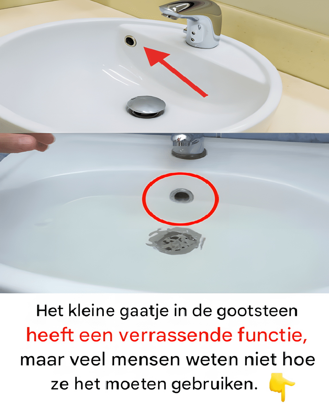 Dit kleine gaatje is rechtstreeks verbonden met de afvoerbuis van de gootsteen. Het dient als veiligheidsvoorziening om te voorkomen dat water overstroomt. Dit probleem kan ontstaan als u per ongeluk de kraan open laat staan, afgeleid wordt door een telefoontje of druk bezig bent met een dringende taak. Zodra het water in de gootsteen een bepaald niveau bereikt, stroomt het automatisch door dit gat naar het riool. Zo voelt u het water overstromen en op de vloer van uw badkamer terechtkomen.