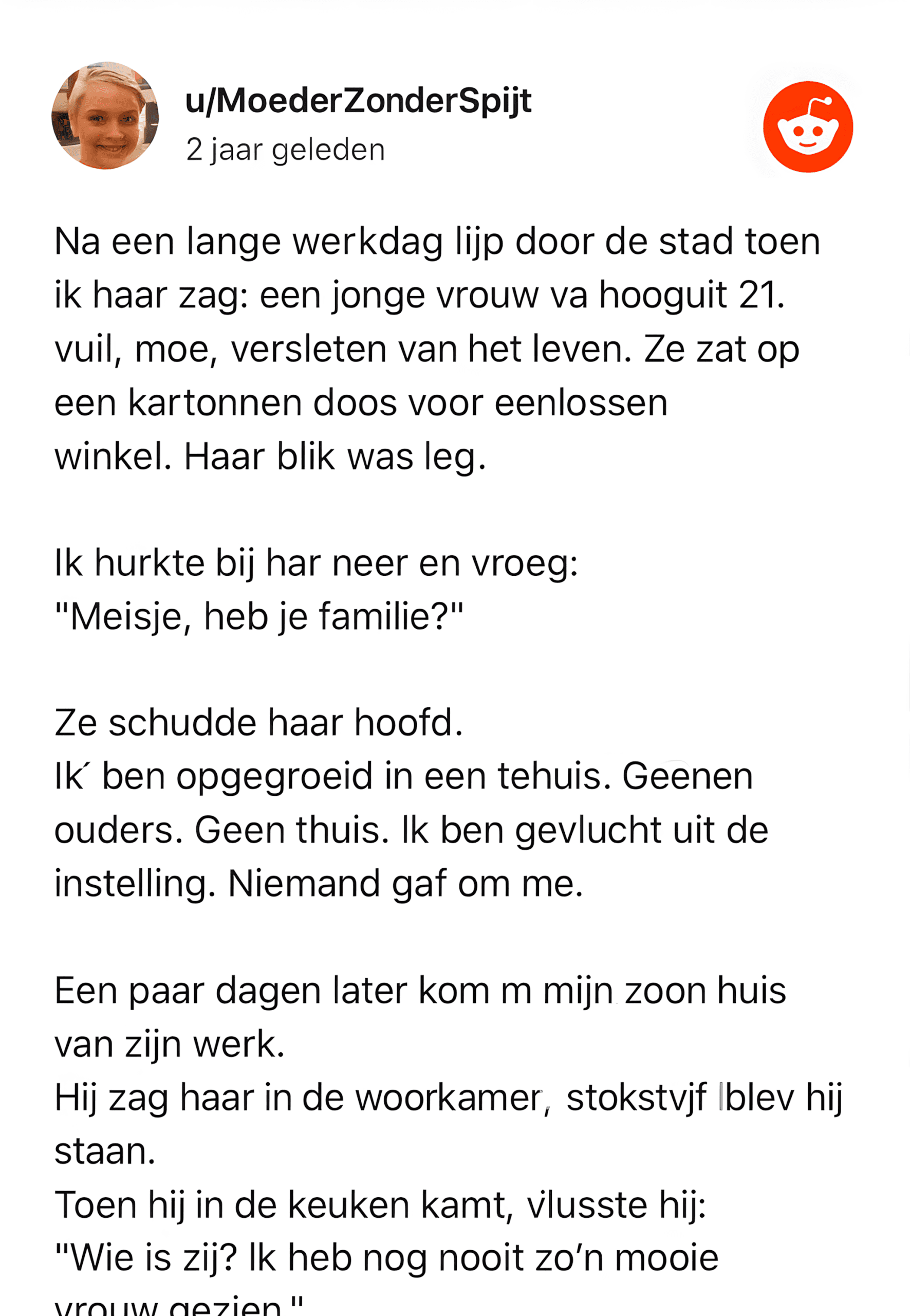 Na een lange werkdag liep ik door de stad toen ik haar zag: een jonge vrouw van hooguit 21, vuil, moe, versleten van het leven. Ze zat op een kartonnen doos voor een gesloten winkel. Haar blik was leeg.