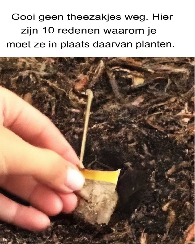 Theebladeren zijn rijk aan voedingsstoffen zoals stikstof, wat essentieel is voor de groei van planten. Begraaf gebruikte theezakjes eenvoudigweg onder de voet van uw planten. Naarmate het zakje ontbindt, komen deze waardevolle voedingsstoffen vrij in de grond.