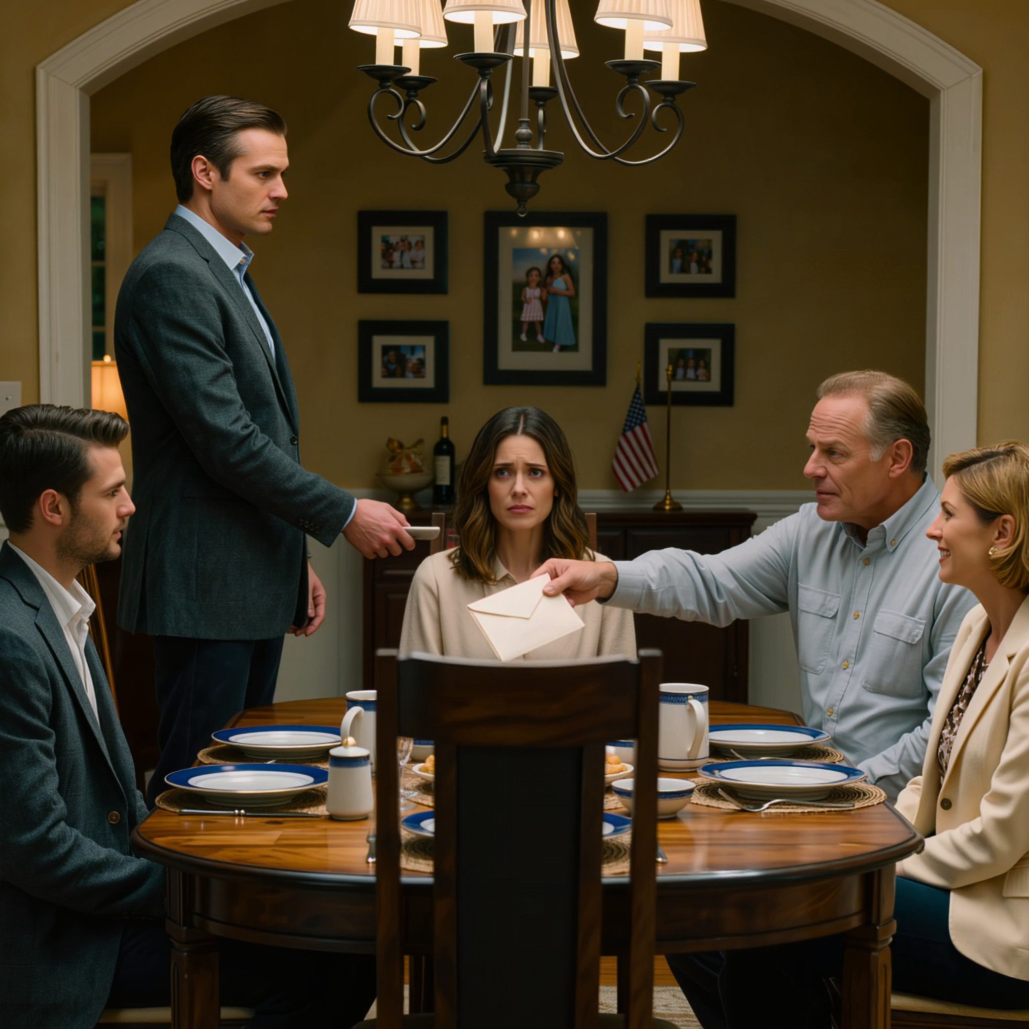 Moeder knikt instemmend terwijl Sarah triomfantelijk straalt. Ik zit als aan de grond genageld. Mijn verloofde, Marcus, zit naast me terwijl 23 jaar lang de verwaarloosde dochter zijn geweest, als een kaartenhuis in elkaar stort. De 10.000 dollar waar ik zes maanden op had gerekend, was weg. Sarah’s zelfvoldane glimlach vertelt me ​​dat dit gepland was. Ik huil niet. Ik kijk alleen maar naar Marcus. De stilte strekt zich uit over onze eettafel uit onze kindertijd. Hetzelfde eikenhouten blad waar ik mijn huiswerk maakte terwijl Sarah hulp kreeg bij haar aanmeldingen voor de universiteit. Vader schraapt zijn keel en leunt achterover in zijn stoel.