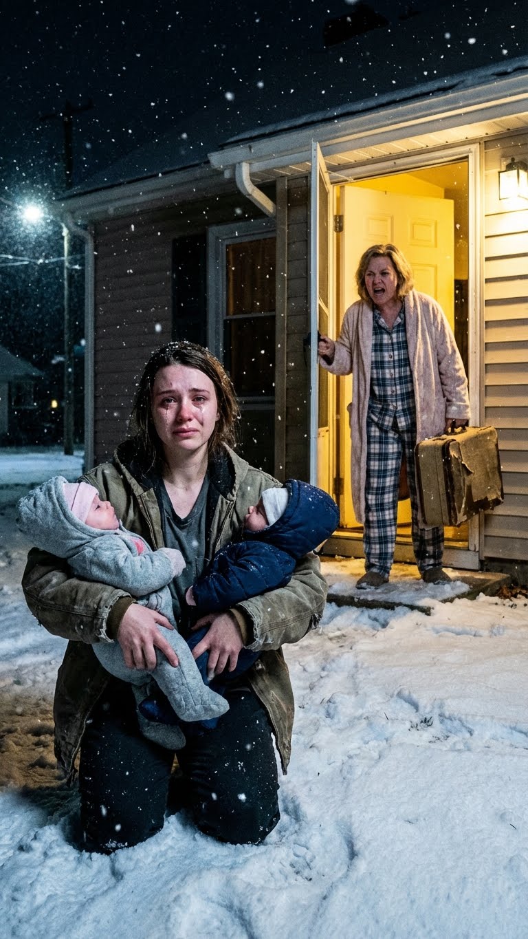 ‘Wegwezen en neem je klootzakken mee!’ schreeuwde mijn schoonmoeder, terwijl ze me bespuugde en mijn man mijn tien dagen oude tweeling en mij de ijskoude nacht in duwde. Ze dachten dat ik een arme, hulpeloze ontwerpster was die ze als vuilnis konden weggooien. Ze wisten niet dat ik de CEO was van een bedrijf met een omzet van 8 miljard dollar, eigenaar van hun huis, hun auto’s en het bedrijf waar mijn man werkte. Terwijl ik daar in de kou stond, pleegde ik één telefoontje, niet om hulp te vragen, maar om een ​​waarheid te onthullen die hen zou doen smeken om de armoede die ze me hadden opgedrongen…