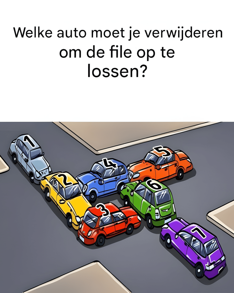 Hier is een kleine visuele puzzel die een beroep doet op je observatievermogen en logica. Het doel is simpel (ogenschijnlijk): identificeer de auto die verplaatst moet worden om de verkeersstroom te versoepelen.
