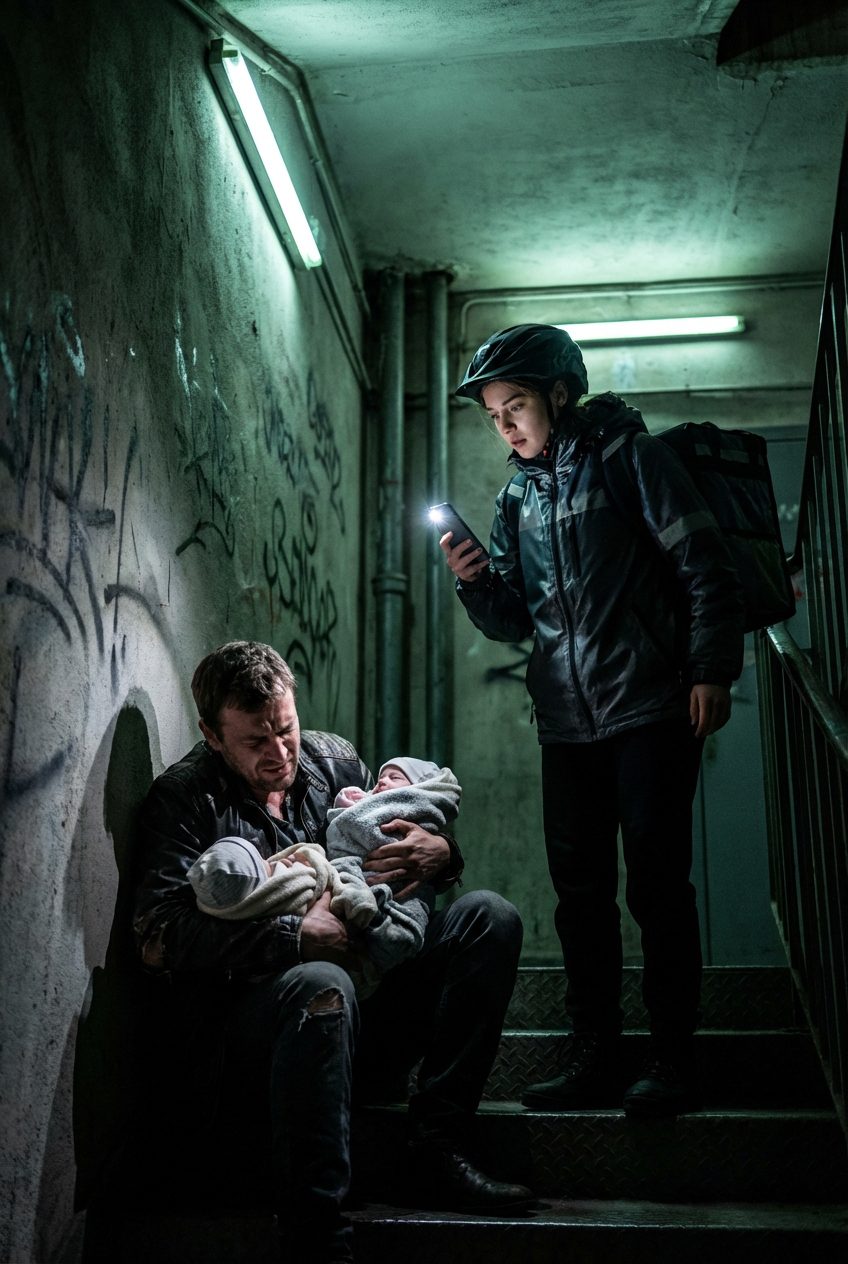 Het trappenhuis was smal en schaduwrijk, slechts verlicht door de zaklamp van haar telefoon, en daar vond ze hem, ineengedoken tegen de muur, zijn leren jas doorweekt, oppervlakkig ademend, zijn armen om twee draagzakken geslagen als de laatste barricade tussen hen en een wereld die al te veel kinderen in de steek had gelaten.