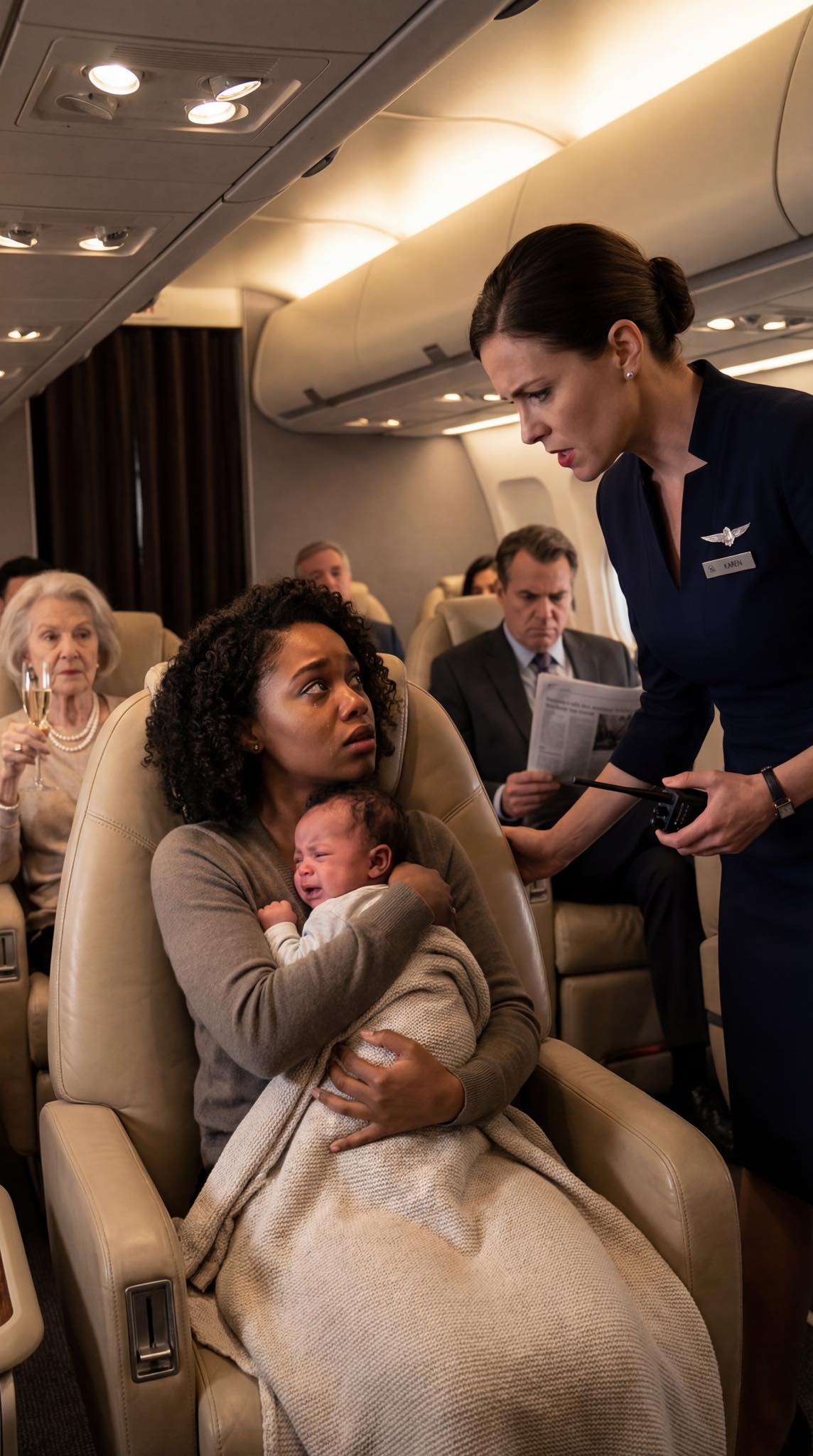 Ik keek verbijsterd op, mijn armen stevig om mijn dochter geklemd, wier gehuil was veranderd van ongemak in pure angst. In het gangpad, perfect omlijst door de plafondlampen alsof ze op een podium stond dat speciaal voor dominantie was gebouwd, stond Vivian Cross, hoofd stewardess. Haar marineblauwe uniform was smetteloos, haar zilveren vleugels gepoetst en haar houding was strak en zelfverzekerd, als iemand die nog nooit in haar leven was bevraagd.