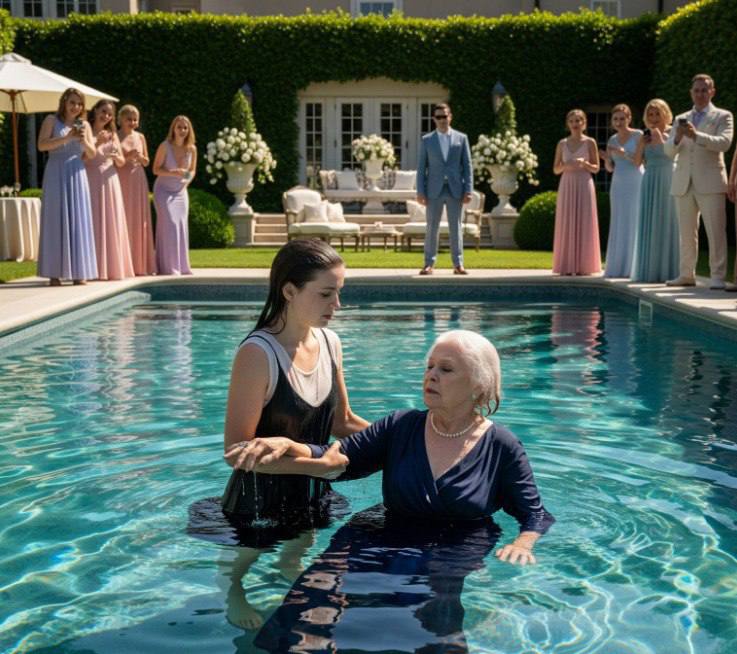 Ze glipte de feestzaal uit, achter het geluid van klinkende glazen en oppervlakkig gelach aan, totdat ze het zwembad bereikte — stil, verlicht door de maan, leeg.