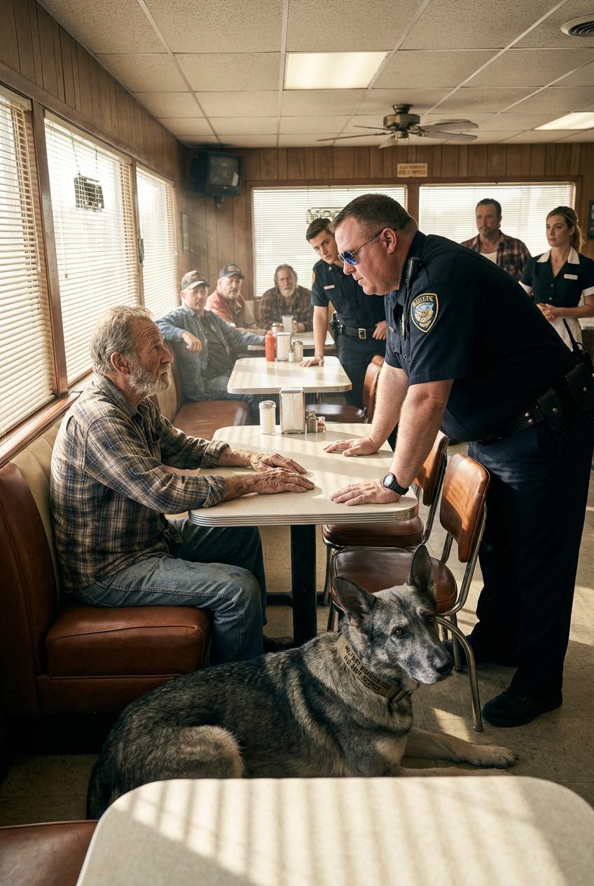 We stapten samen de hitte in, als één geheel, zonder leash, zonder bevelen, en staken het terrein over naar de eetgelegenheid waarvan de chromen buitenkant eruitzag alsof hij sinds de jaren vijftig alleen op pure koppigheid had overleefd. Ik was niet op zoek naar aandacht, problemen of erkenning. Ik was gewoon een 76-jarige man die naar het westen reed, zonder schema, zonder publiek en zonder de behoefte om uit te leggen wie ik vroeger was.