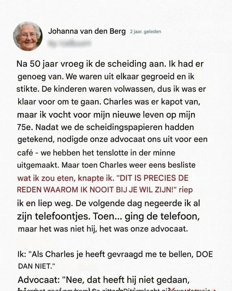 Wat begon als spanning over triviale dingen – de thermostaat, de boodschappen, het volume van de tv – ontaardde langzaam in iets zwaarders. En op een herfstmiddag sprak ze de woorden uit die ze al jaren in haar borst had geslikt: