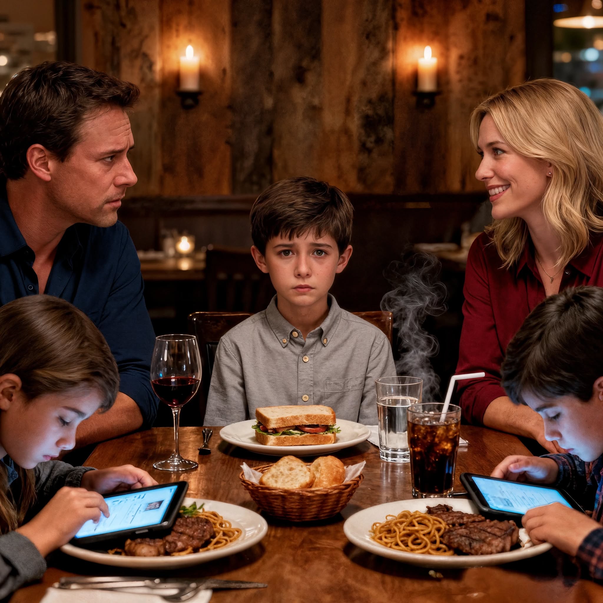 Jill boog zich over de tafel en schoof een klein broodmandje naar Mason. « We hebben niet voor je zoon besteld, » zei ze met een theatrale zucht, alsof het een daad van grote vrijgevigheid was. Haar kinderen keken niet eens op, verdiept in hun dampende truffelmacaroni met kaas.