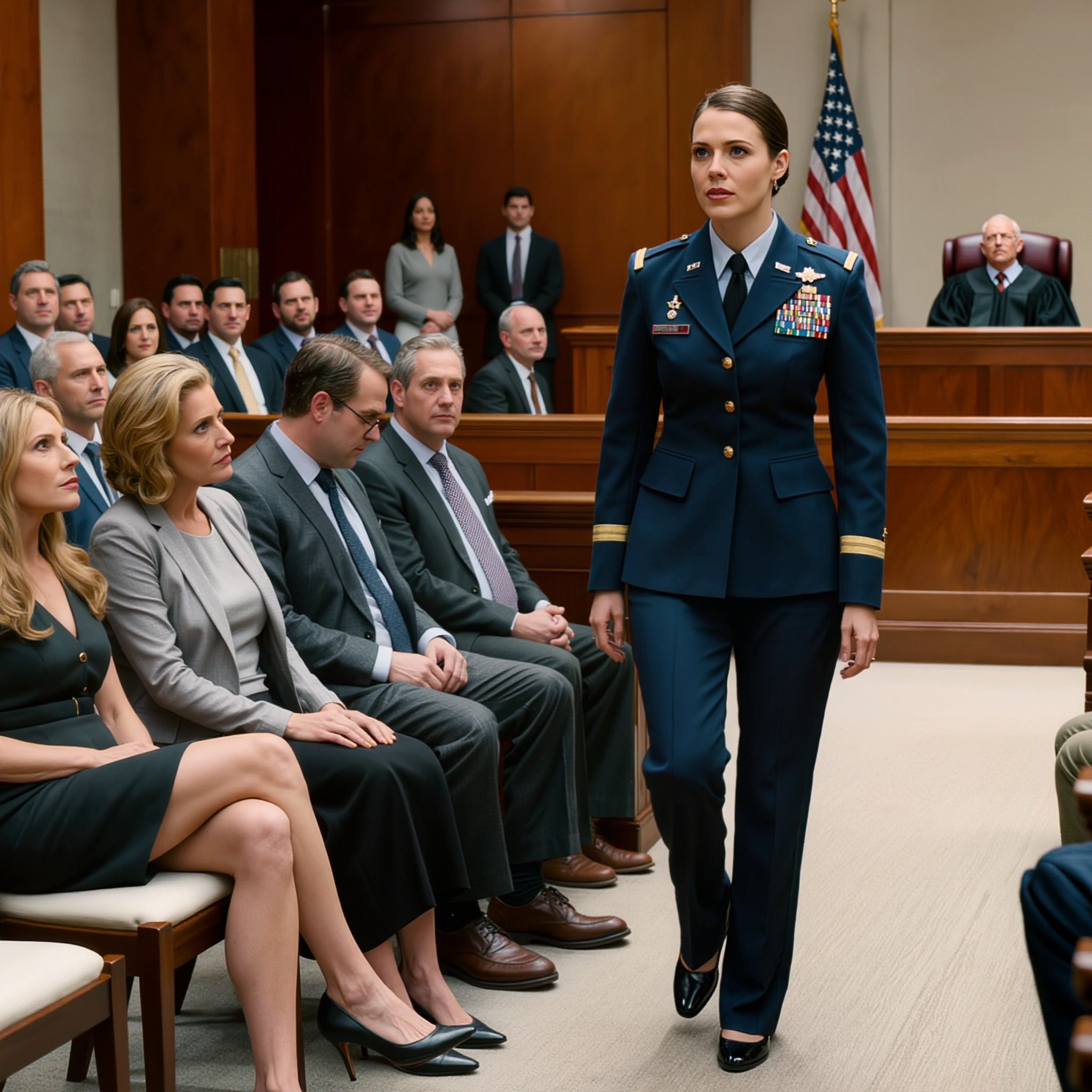 De lucht in de rechtszaal voelde ongewoon stil aan, als de stilte voor een storm. Gepolijst hout glansde onder de plafondlampen en de stilte hing als een zware last die op elke ademhaling drukte. Ik stapte in volledig uniform door de zijdeur naar binnen, mijn medailles weerkaatsten in het licht, mijn laarzen landden zacht maar vastberaden op de vloerbedekking.
