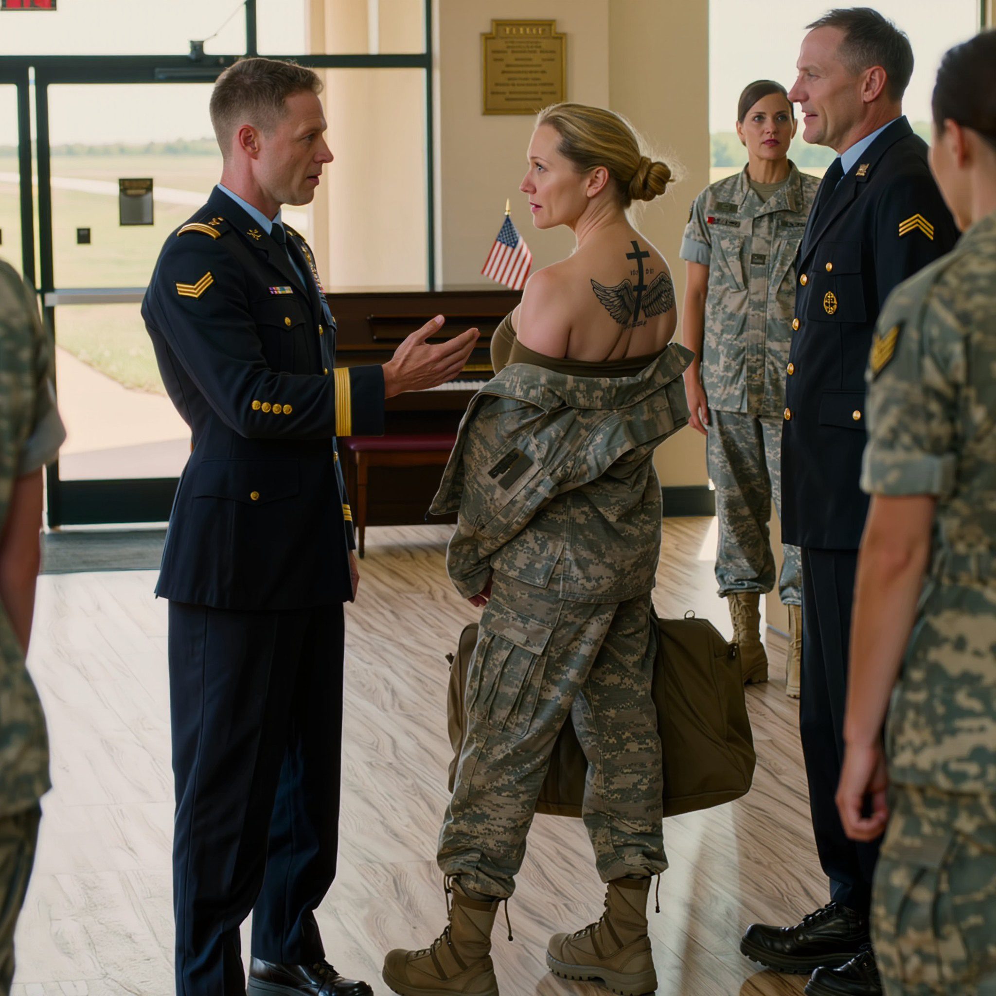 ‘Mevrouw, uw afspraak is bevestigd,’ zei specialist Reed, terwijl hij afwisselend naar zijn scherm en Laura’s identificatie keek. ‘Ik moet echter nog even de kwestie van het uniform aankaarten. Volgens het basisbeleid mogen alleen militairen in actieve dienst militaire uniformen dragen op de basis. Ik verzoek u daarom om u om te kleden in burgerkleding voordat u naar uw afspraak gaat.’